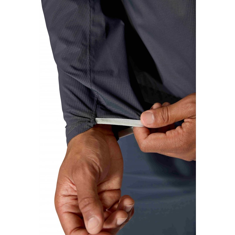 Półelastyczne, wydłużone mankiety zapewniają wygodne dopasowanie bez zbędnego ciężaru dodatkowych regulacji, a jednostronna regulacja dolnego brzegu z zabezpieczeniem przed zaczepianiem pozwala na szybkie dopasowanie nawet w ruchu. Odblaskowe logo Rab i nadruk tylny zwiększają widoczność w warunkach słabego oświetlenia. Materiał wierzchni kurtki Rab Downpour Trail Light Jacket pokryty jest ekologiczną, wolną od szkodliwych fluorowęglowodorów powłoką DWR, co podkreśla zaangażowanie marki Rab w zrównoważony rozwój. Skład (55% poliamid, 45% poliamid z recyklingu z membraną poliuretanową) dodatkowo potwierdza tę filozofię.
