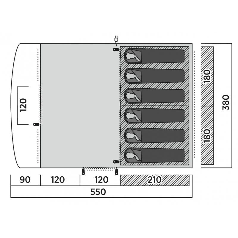 • rodzinny namiot tunelowy z dużą przestrzenią dzienną i przednim wejściem chronionym przed deszczem