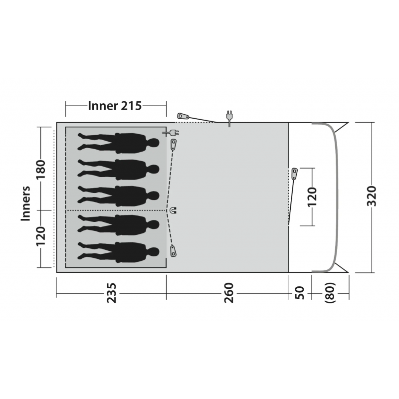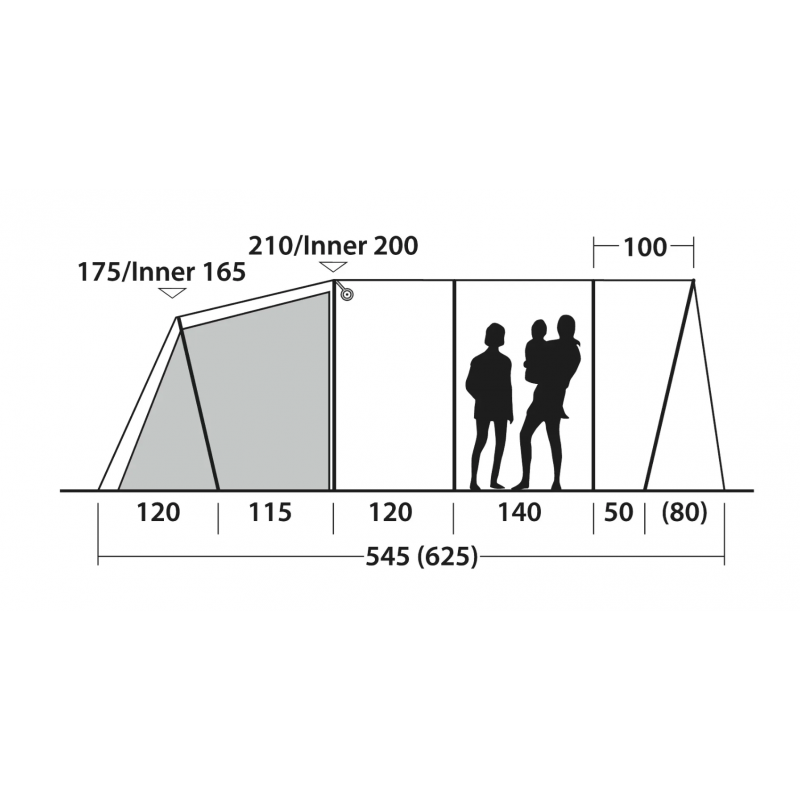 Układ trzech pomieszczeń został zaprojektowany z myślą o maksymalnej funkcjonalności. Dwie oddzielne sypialnie Dark Premier zapewniają spokojny wypoczynek dla pięciu osób, skutecznie blokując poranne światło i umożliwiając dłuższy sen. Centralny salon stanowi wygodną przestrzeń dzienną, idealną do wspólnych posiłków i relaksu, niezależnie od pogody na zewnątrz. Wentylacja mesh w sypialniach gwarantuje optymalną cyrkulację powietrza i komfort termiczny podczas ciepłych nocy. Charakterystyczna pionowa przednia ściana z baldachimem i zwijalnymi bocznymi osłonami tworzy dodatkową przestrzeń użytkową, która doskonale sprawdza się jako strefa wejściowa lub miejsce do przechowywania sprzętu. Podwójne zamki błyskawiczne w drzwiach frontowych, wsparte pełnymi panelami mesh, oferują elastyczne opcje wentylacji bez ryzyka wtargnięcia insektów. Dodatkowe boczne drzwi z panelem mesh zapewniają alternatywne wejście i poprawiają przepływ powietrza wewnątrz namiotu.