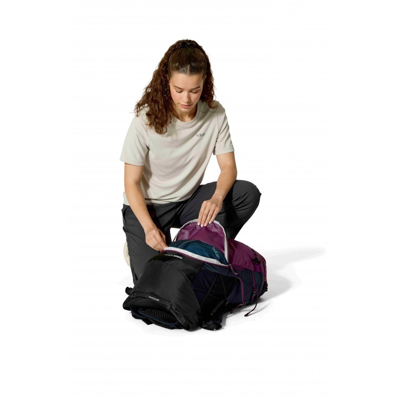 Plecak damski Rab Airox 34 z regulowanym systemem noszenia do trekkingu i wędrówek schroniskowych.