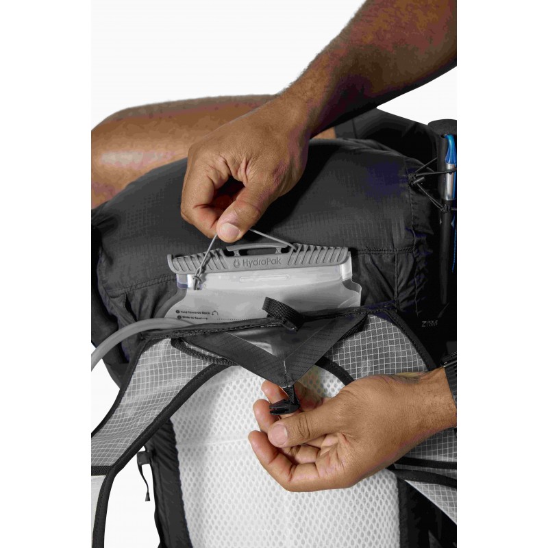 Praktyczne rolowane zamknięcie górne z opcją bocznego zapięcia umożliwia błyskawiczne dostosowanie objętości plecaka do aktualnych potrzeb. Przemyślany układ kieszeni, w tym dwie zapinane na zamek kieszenie na pasie biodrowym, pozwala na organizację ekwipunku w sposób zapewniający natychmiastowy dostęp do najważniejszych akcesoriów bez zatrzymywania biegu. Elastyczne kieszenie boczne i przednia kieszeń siatkowa idealnie nadają się do przechowywania przekąsek energetycznych, dodatkowej warstwy odzieży czy mapy. Zintegrowany system mocowania kijków trekkingowych umożliwia ich błyskawiczny montaż i demontaż w trakcie biegu, a dedykowane miejsce na system nawadniający oraz kieszenie na bidony w uprzęży zapewniają stały dostęp do płynów.