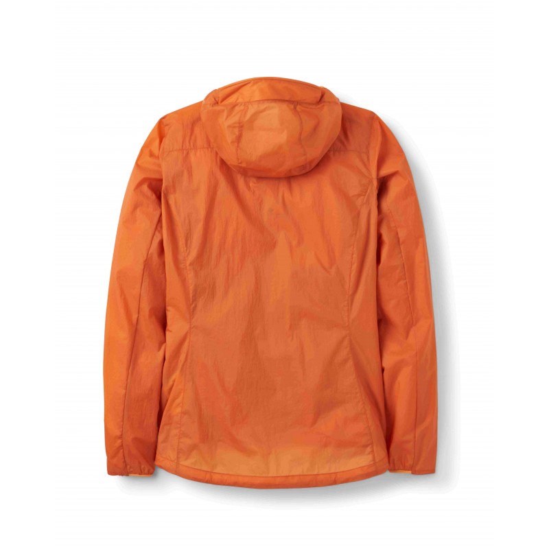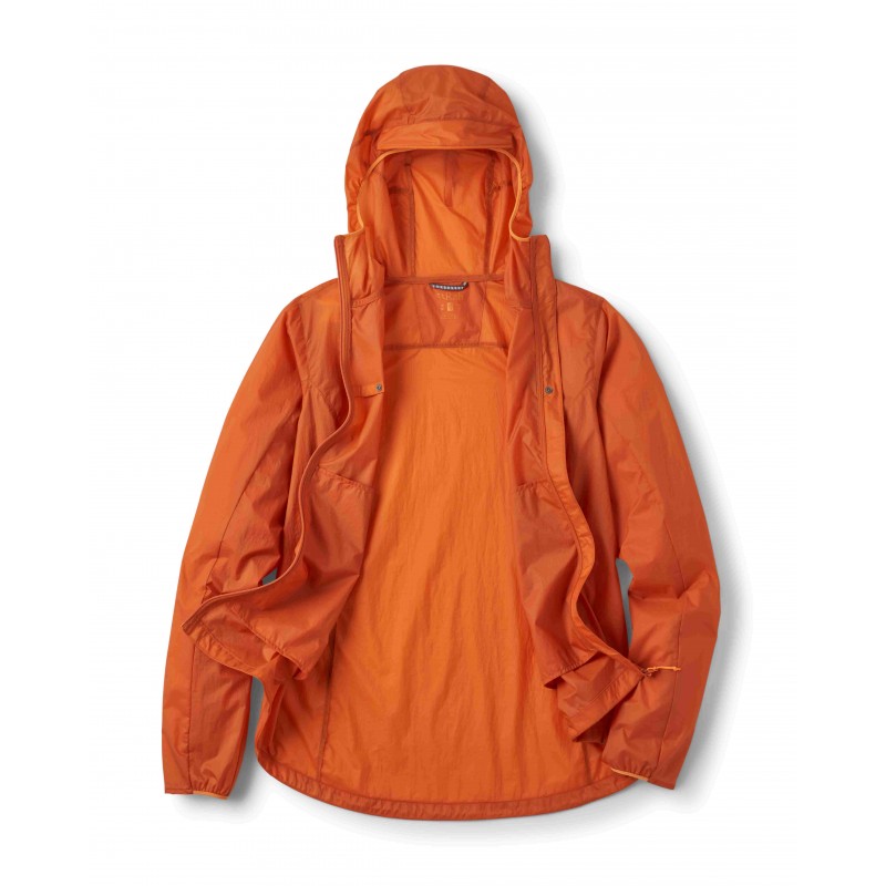 Kurtka została wykonana z wytrzymałego, wiatroodpornego nylonu Atmos™ o gramaturze 20D (48 g/m²). Materiał pokryto ekologiczną powłoką DWR niezawierającą fluorowęglowodorów, co zwiększa jego odporność na lekkie opady deszczu i mżawkę. Dzięki temu Rab Vital Hoody Wmns zapewnia natychmiastową ochronę przed wiatrem i nieprzewidzianymi zmianami pogody. Kurtka wyposażona jest w elastyczny kaptur ze sztywnionymdaszkiem, który zapewnia dodatkową ochronę przed deszczem i wiatrem. Regulacja objętości z tyłu kaptura umożliwia idealne dopasowanie do kształtu głowy, zwiększając komfort użytkowania.